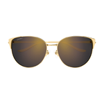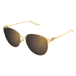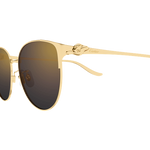 Panthère de Cartier, évolution moderne en métal, caractérisée par la silhouette iconique de l'animal en deux dimensions, épousant parfaitement la face et la charnière. Monture cerclée ronde sophistiquée, pour un look contemporain. Charnière ornée de la silhouette emblématique de la Panthère conçue dans les moindres détails. Finition précieuse en or et manchons métalliques évoquant le mouvement de la queue de la Panthère.